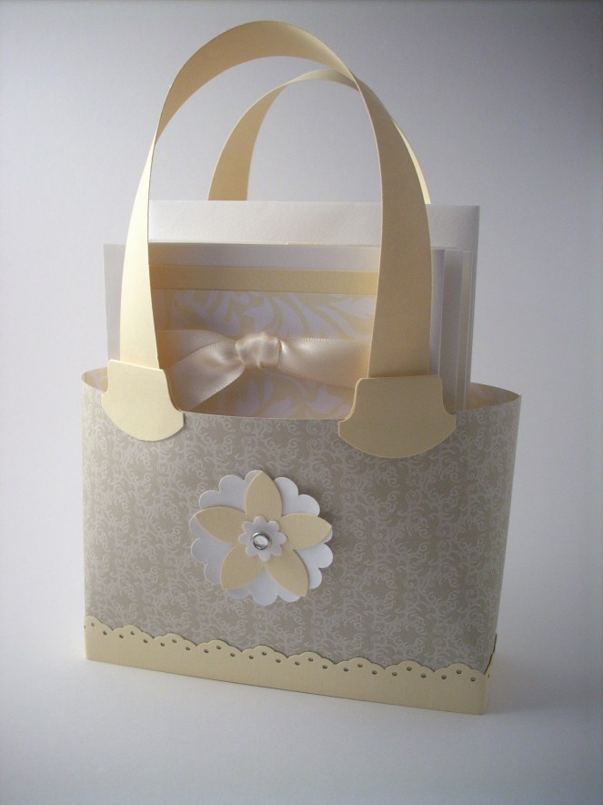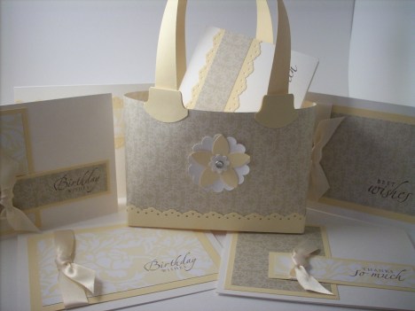I thought I’d share with you something I made as a present for the hostess of one of my recent workshops – this set of 6 greetings cards with matching gift bag – you can find the instructions for this on Chiaki Haverstick’s website.