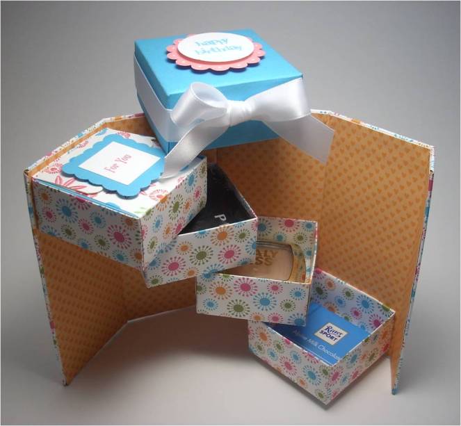 I filled each box with small items such as earrings, a compact and some chocolate. She loved it!
