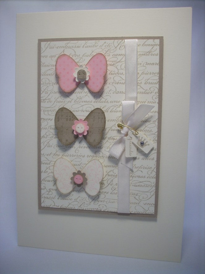 Cardstock: very vanilla, crumb cake, pretty in pink; Inks: pretty in pink, crumb cake, pink pirouette; Stamp sets: tiny tags, en français, dot dot dot, music notes wheel, bliss (retired); Punches: butterfly, boho blossoms, ¼” circle (retired), jewelry tag; Accessories: very vanilla taffeta ribbon, basic rhinestones, paper piercer and mat pack, sponge daubers, crumb cake marker pen, stampin dimensionals, safety pin from my sewing box.