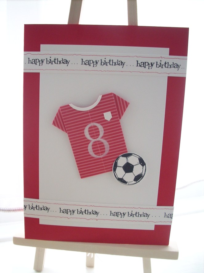 Male cards are not always easy to do, but I made this football-inspired one for my nephew’s birthday recently – he, of course, supports Liverpool. I got it wrong and put the football player’s number on the front of the shirt…but what do I know about football?! Still, you get the idea ….