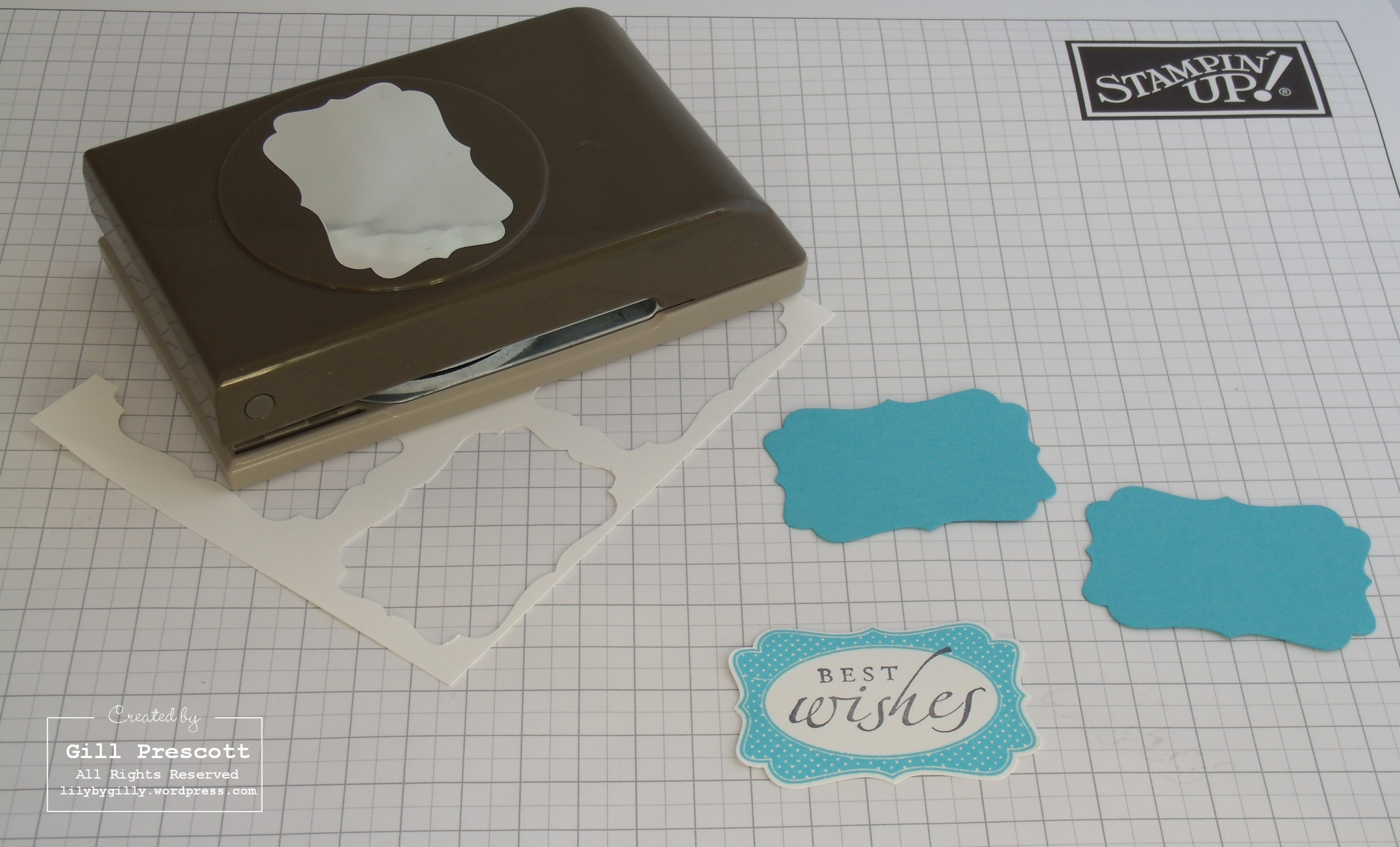 2) Punch out the stamped image using the decorative label punch, plus two more labels from coloured cardstock.