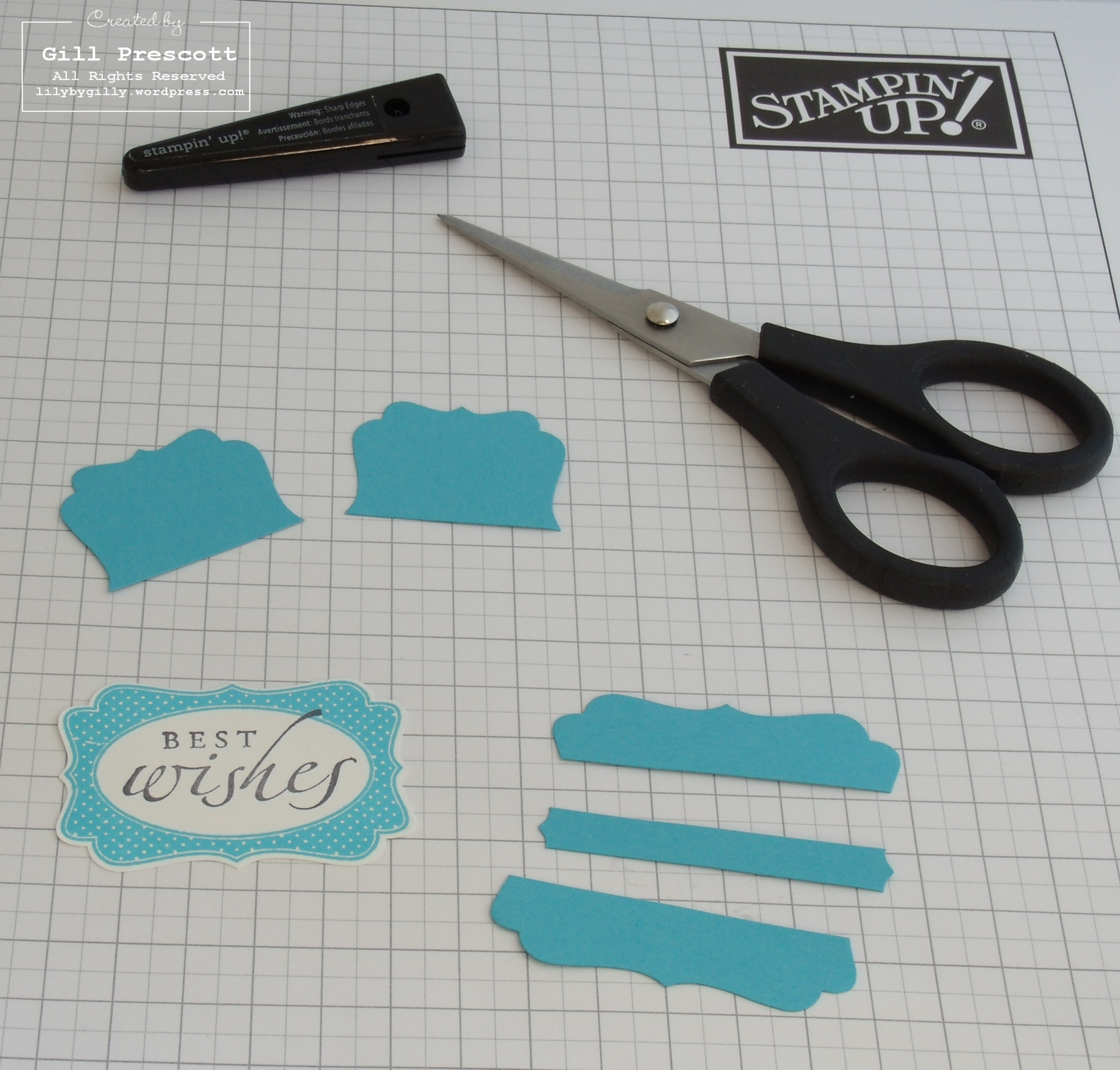 3) Next, cut the two cardstock labels as shown, one in half across the shortest width, and cut away a small strip down the centre of the other and discard it.