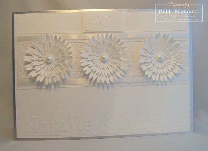 So I turned to my trusty big shot machine to die cut the flower daises and alphabet letters, and also to emboss the vintage wallpaper border from whisper white cardstock. Heat and stick powder was fab for adding dazzling diamonds to the greeting at the top of the card. It doesn’t show up very well on the photo, but looked so nice in real life, and added a touch of sparkle. Some whisper white organza ribbon and large, flat-backed pearls from the pretties kit completed the card.