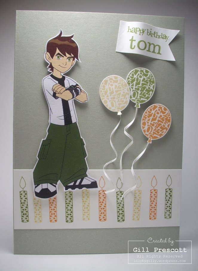 A while back, my friend Jon asked me to make a card for his nephew, Tom, who is really keen on Ben 10. I didn’t know where to start at first as I have nothing in my craft stash like this at all! So Jon helped me out by giving me a picture of the character which I used as a topper on the card, mounted with stampin’ dimensionals …