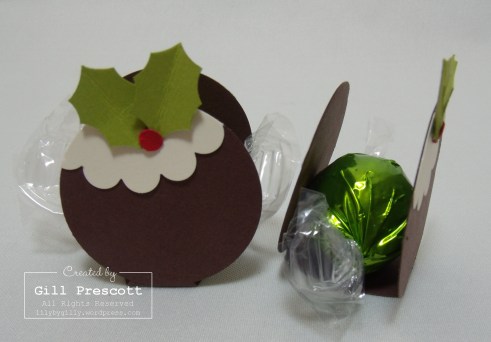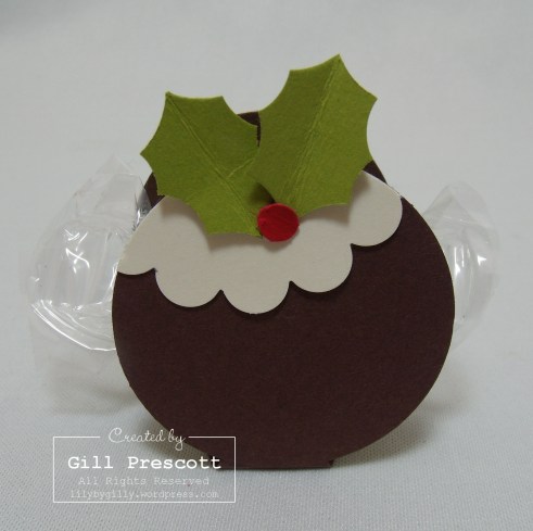 I used chocolate chip and very vanilla cardstock from Stampin Up, for the puddings, with holly made from lucky limeade and real red card. I used a variety of punches from Stampin Up – they make it so easy to produce great results.