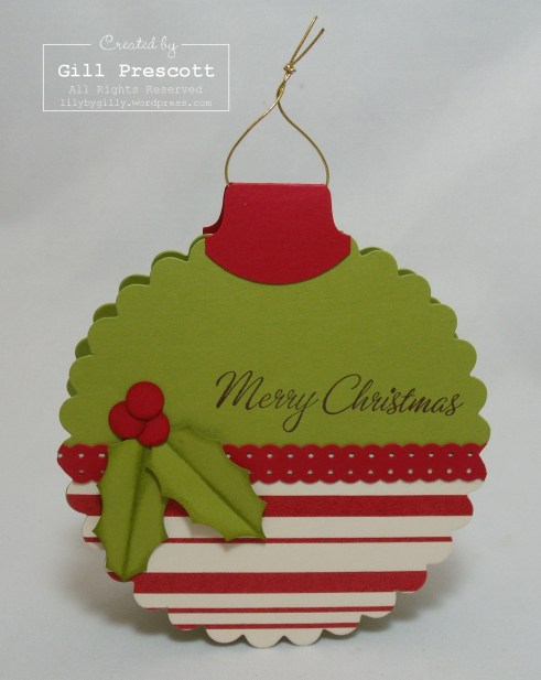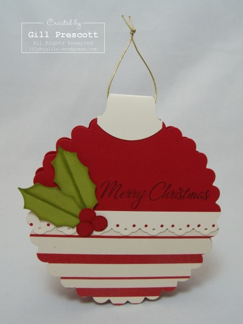 I used border punches and a variety of circles punches to make the embellishments, and added a small length of gold elastic thread from Stampin’ Up! (sadly retired), to be the “hanger” of the bauble.