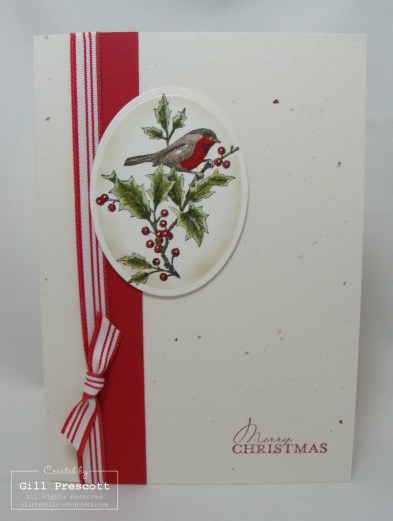 Once I was happy with the coloured image, I cut out it out in an oval shape, and sponged with crumb cake ink for added interest. I mounted it onto a piece of A4 confetti white cardstock from Stampin Up, folded in half to make an A5 card, and added a strip of real red cardstock and a length of ribbon (sadly retired) tied in a knot. The sentiment is from the Contempo Christmas stamp set.