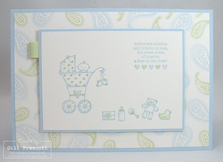 I stamped the main images in marina mist ink, with the bundle of love stamp set from Stampin Up, and then made my own background paper to mount it on to by stamping with the spiced paisley stamp set from the spring mini catalogue – but it’s only available until Monday 30th April 2012 – so you need to hurry if you want to get yours!