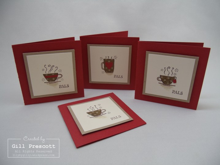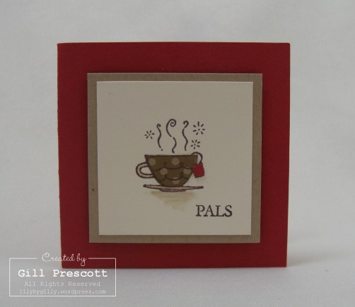 cardstock: riding hood red, crumb cake, very vanilla; stamp sets: friendly words, take a sip; ink: early espresso;  accessories: neutrals dsp, stampamajig.