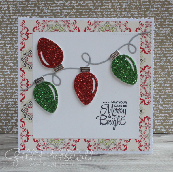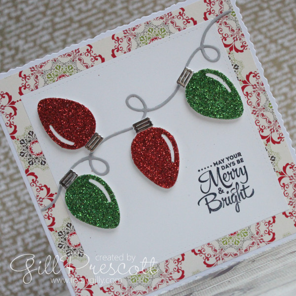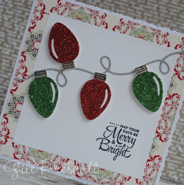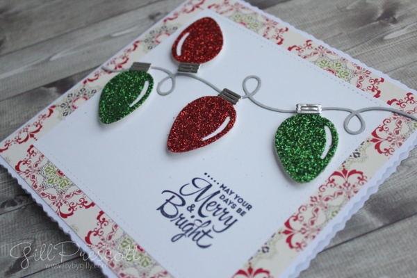 I die cut the Christmas lights from red and green glitter paper, and the tops from silver cardstock.  The background is dsp by Stampin’ Up that I’ve had in my stash for ages – glad to have put it to good use at long last!