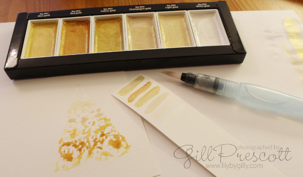 We watched a fab demonstration using these watercolours in shades of gold and the lady made it look so easy! The paints are gorgeous – they shimmer and shine beautifully, I just had to have them…