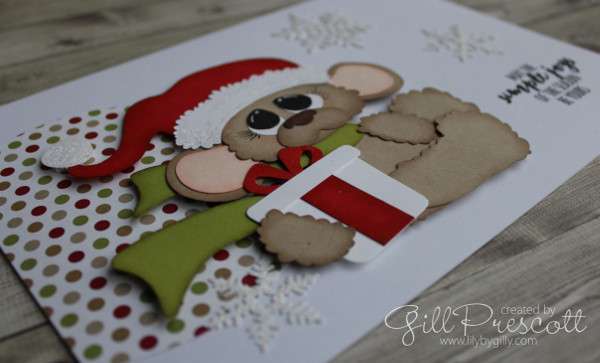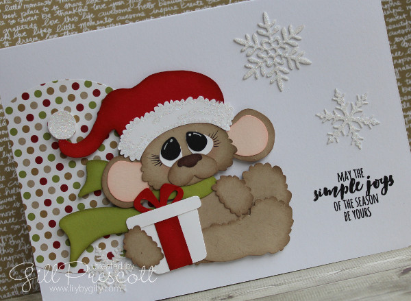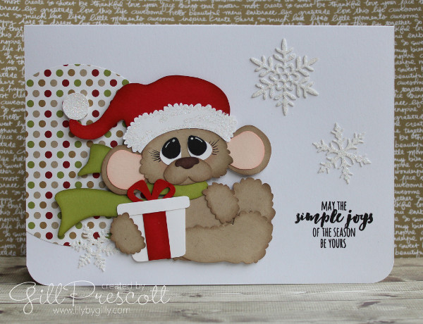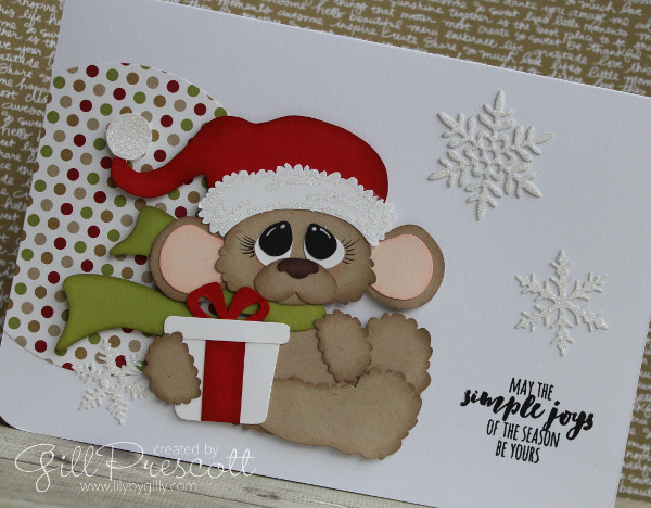 I just love this cute paper-pieced mouse, which was one of the patterns I purchased recently from Treasure Box Designs – isn’t he adorable?! I sponged the edges of the card pieces in matching ink and popped him up on dimensionals …