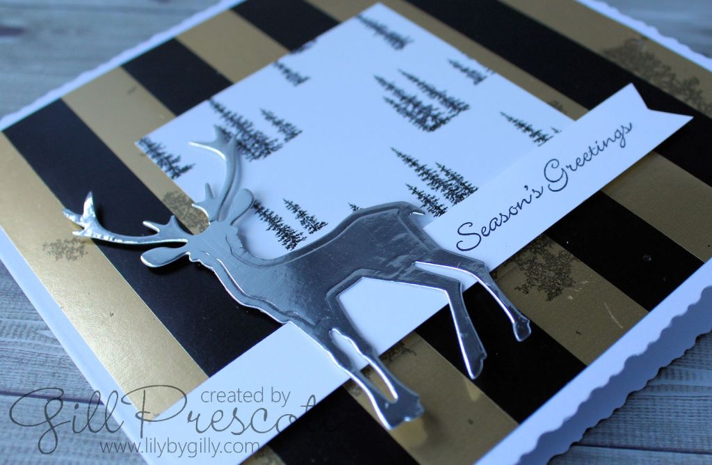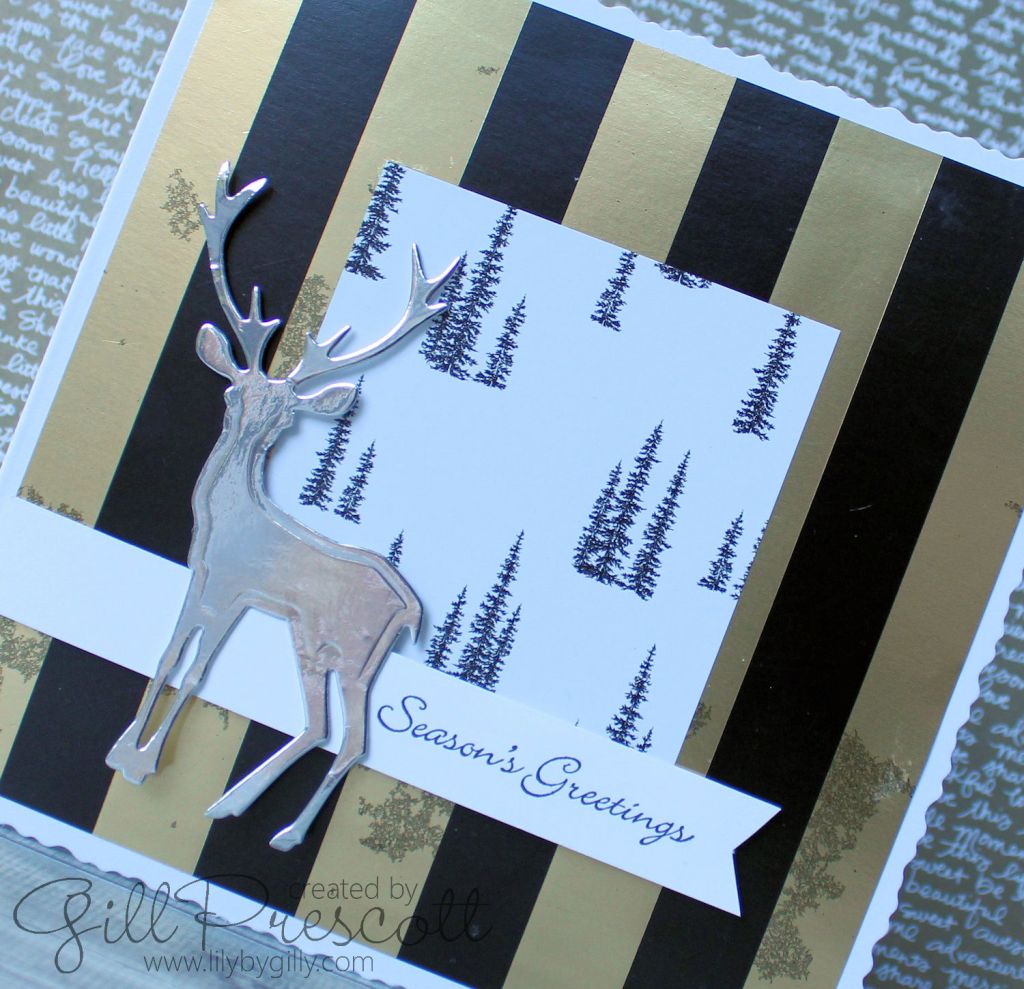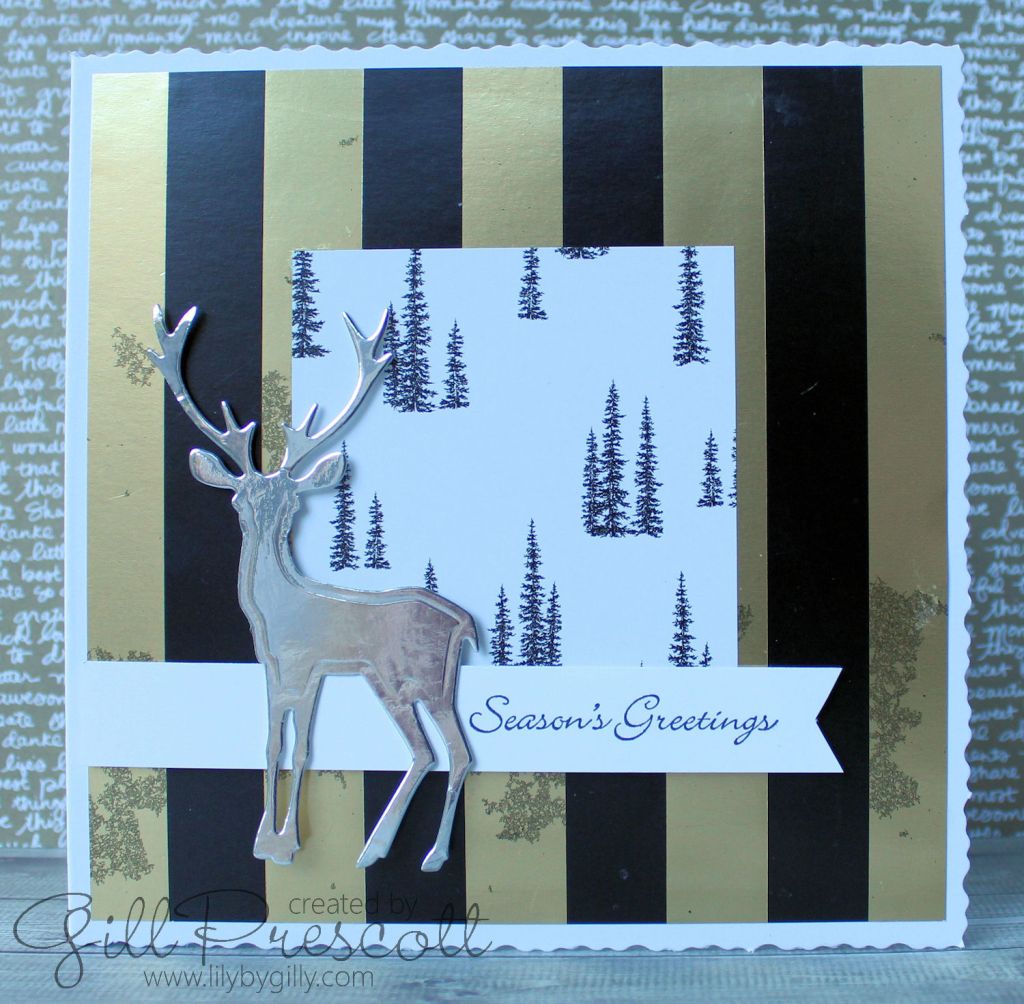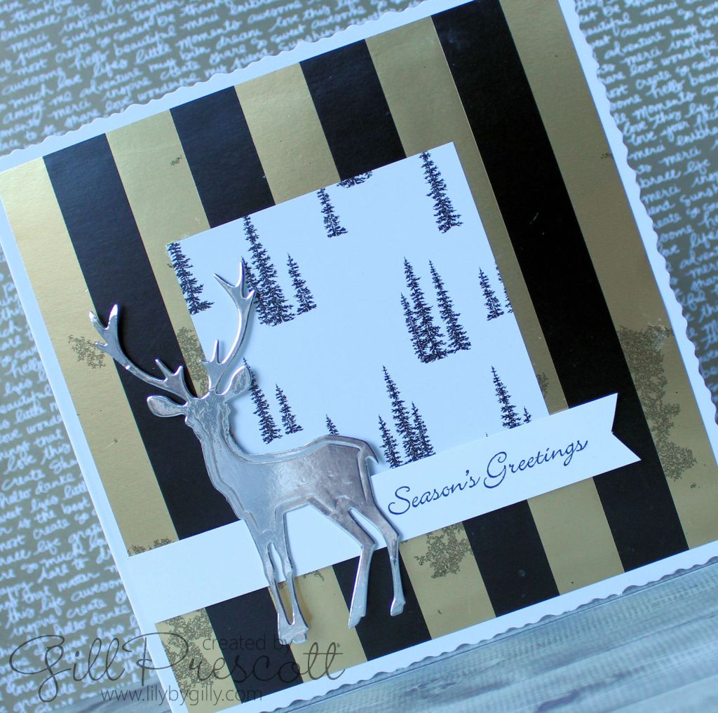 I chose two designs of Winter Wonderland speciality dsp by Stampin Up – the black and gold metallic striped background paper is really lush. I’ve been holding on to this paper for a while, stroking it occasionally but frightened to cut into it, but I think it was worth it for this card…
