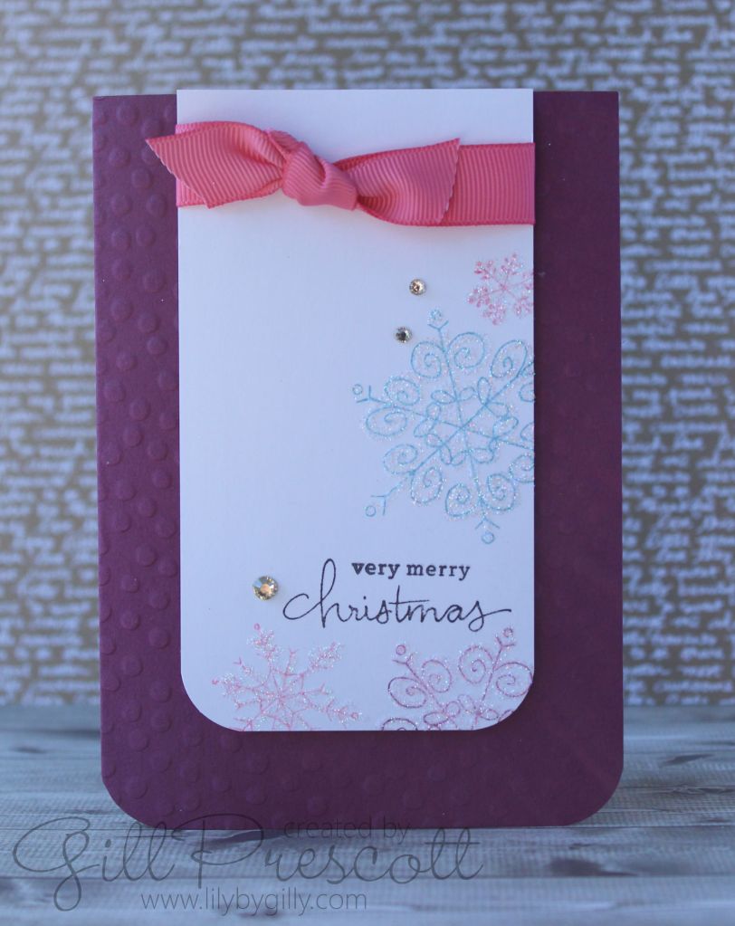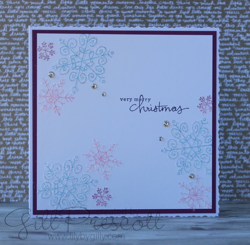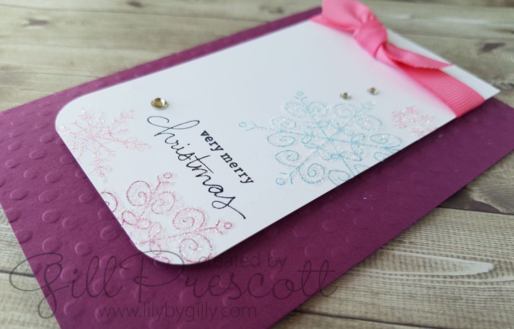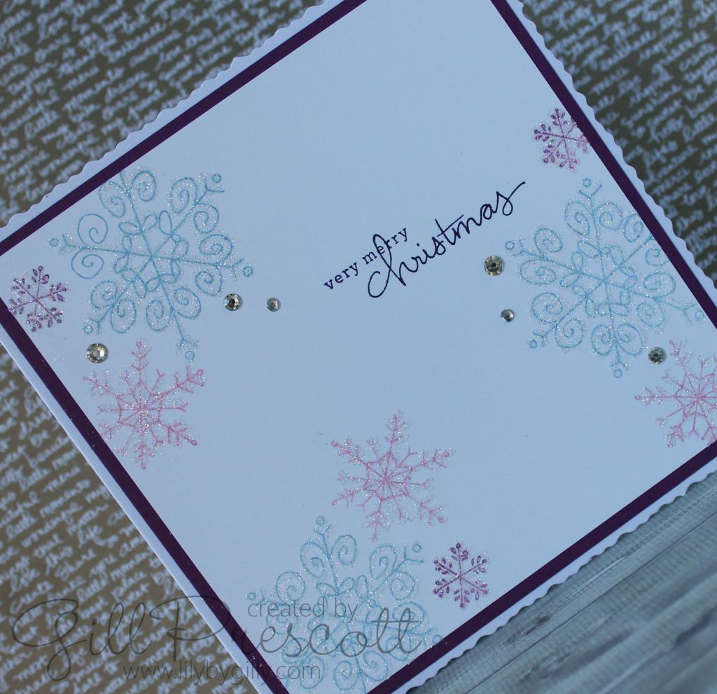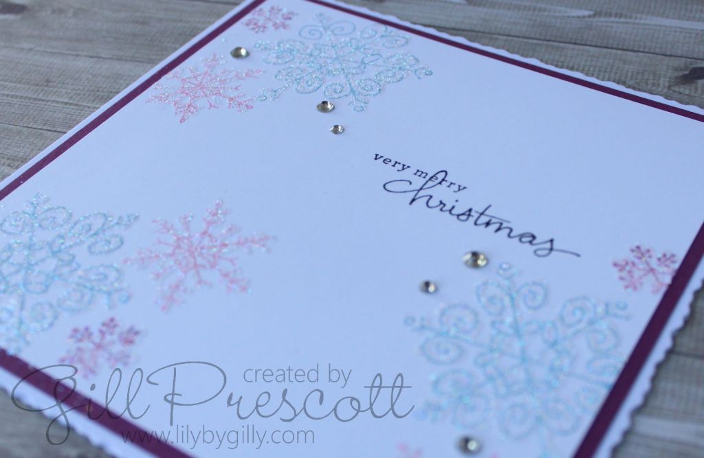 I mounted it onto a piece of rich razzleberry card and then onto a deckled edged card base. A sprinkling of rhinestones across the card added a bit of bling, and I just couldn’t resist adding dazzling diamonds to the snowflakes with a glue pen, for added Christmas sparkle …