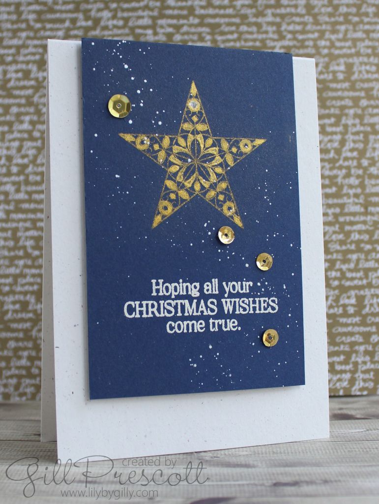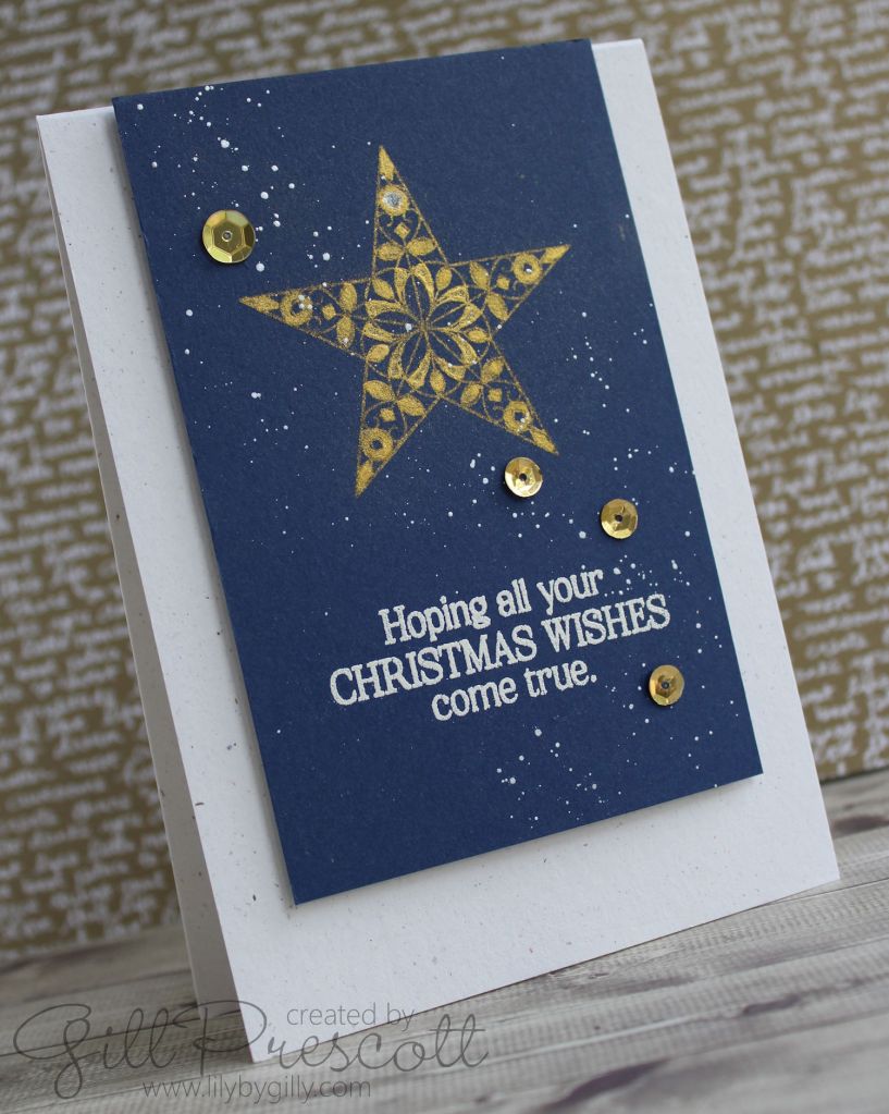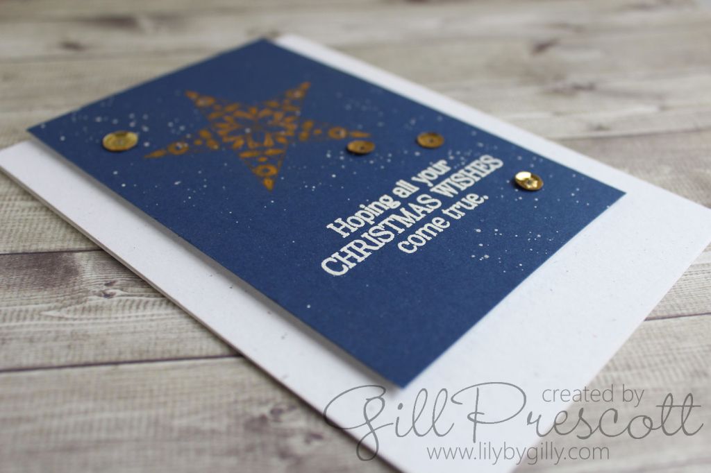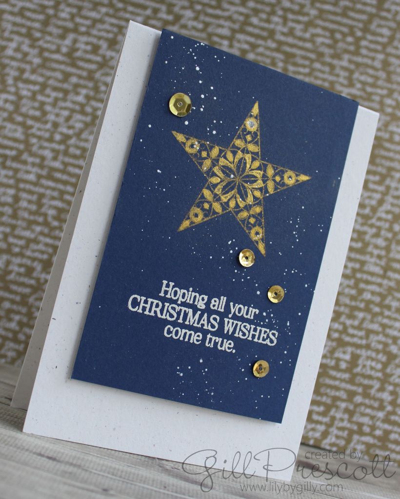 To give a starry sky look, I mixed perfect pearl with water and splashed this randomly over the card. It’s so pretty in real life – the sheen really glimmers in the light.