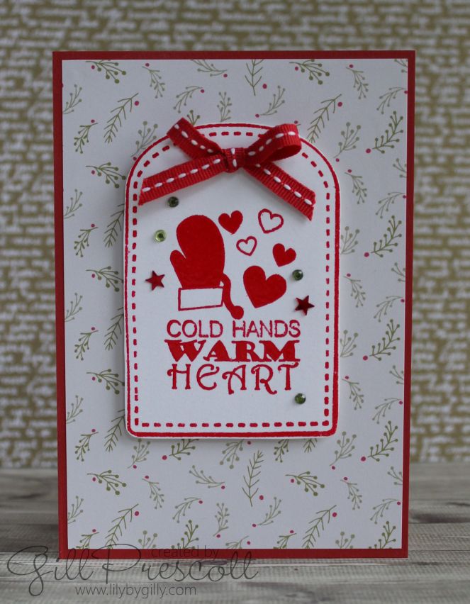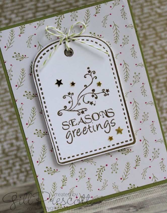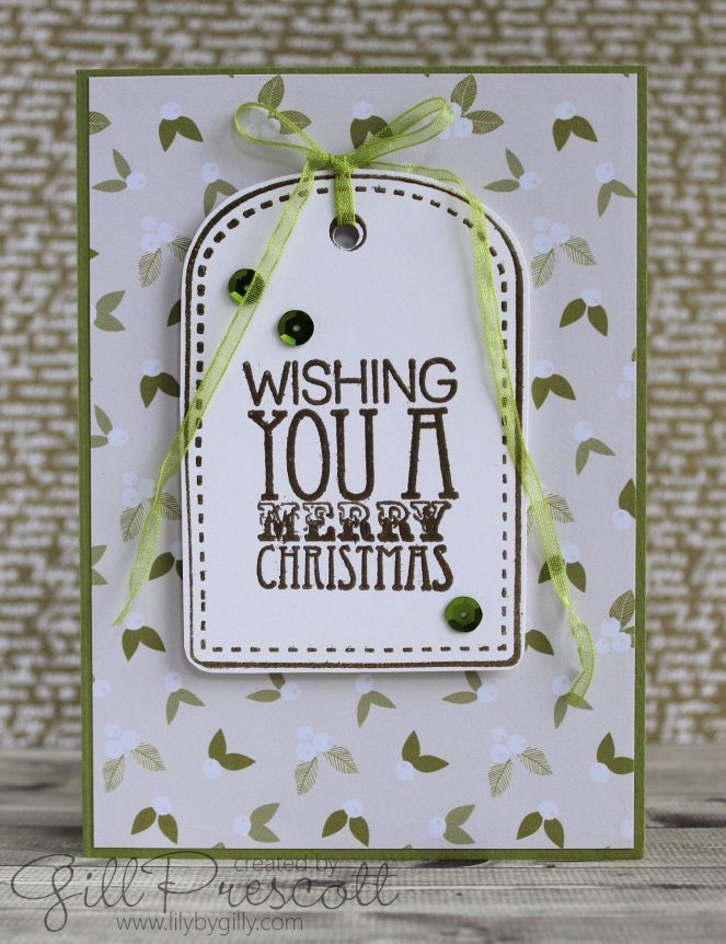 I hand cut the tag, tied a Stampin Up ribbon at the top and mounted it onto and old olive base card by Stampin Up. The pretty paper layer is by the Lovely Studio. Finally, I added a few green sequins to finish.