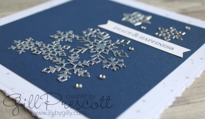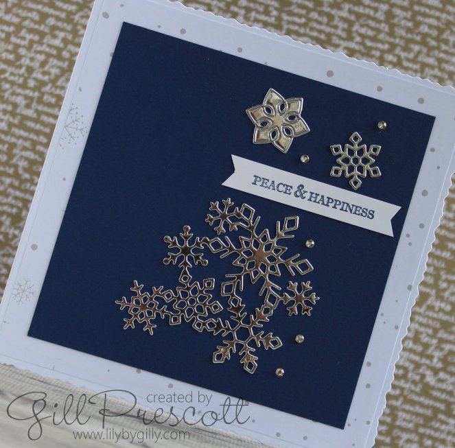 I used the Christmas Layers die set by Stampin Up to cut snowflakes in silver card and adhered them to a piece of night of navy card, following the sketch. I didn’t pick out the centre of the top snowflake – I thought it looked pretty as it was.