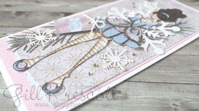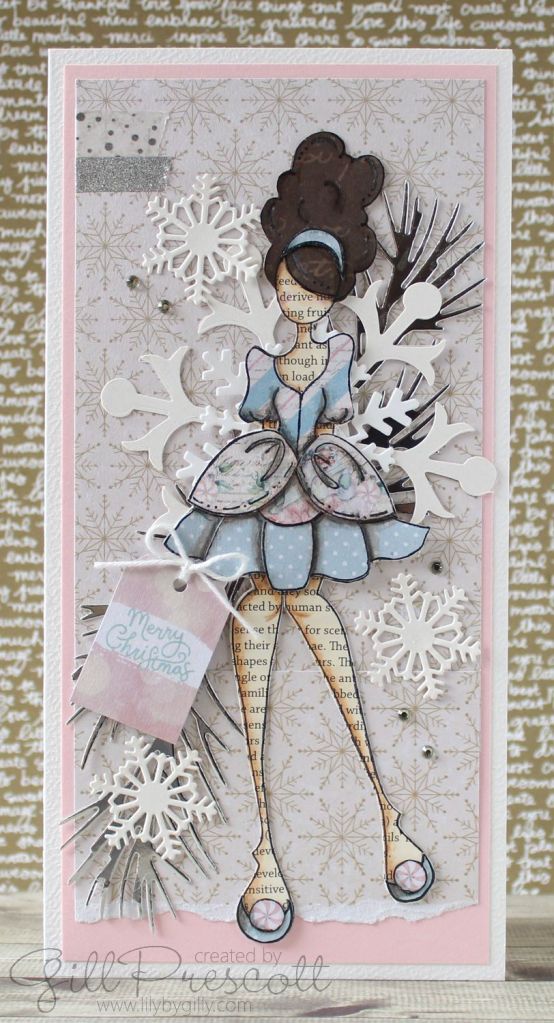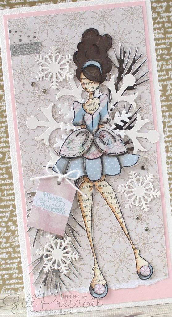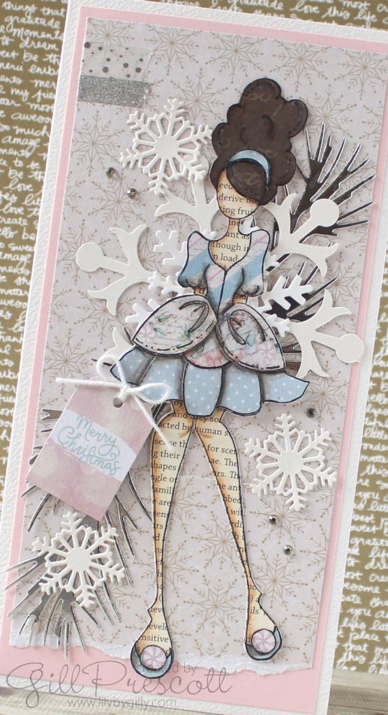The pompoms on her shoes were fussy cut from one of the Prima Christmas papers, and the tag from one of the tag sheets in the set. I added a layer of pink pirouette cardstock to the card base, and layered the snowflake paper on top, tearing the bottom edge to add a little interest. I added various snowflake die cuts in shimmer white card by Stampin Up, and the Tim Holtz sprigs in silver card by Sizzix.
