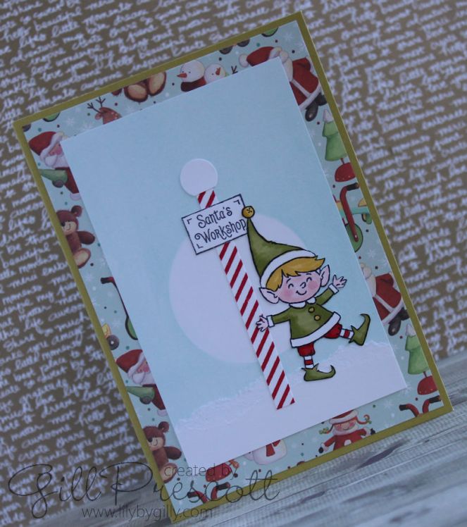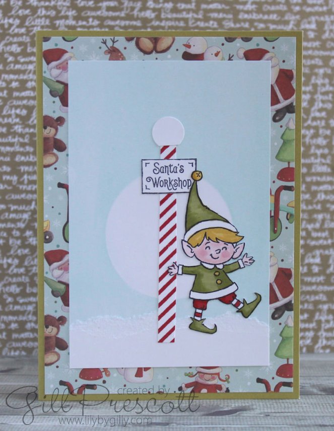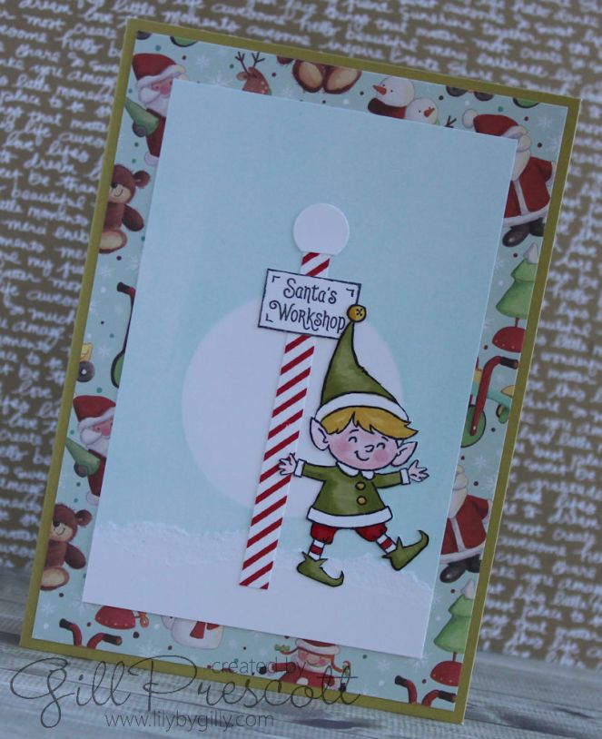I stamped the stripes in real red ink on whisper white card using a stripes stamp, which is a long-retired single stamp which I’ve had for years. I turned the card and cut a strip on the diagonal so the stripes were now going in the right direction. I punched out a small circle in white and cut straight across to create a flat bottom for the top of the north pole. The little elf was stamped on whisper white card using black stazon ink and coloured with Stampin Up markers in real red, daffodil delight and lucky limeade. I then fussy cut the little elf, cutting away the present he was standing on in the original image, and the bauble he was holding too – I thought this fit much better on my card. The Santa’s workshop sign was from the same stamp set which I also stamped and fussy cut out.