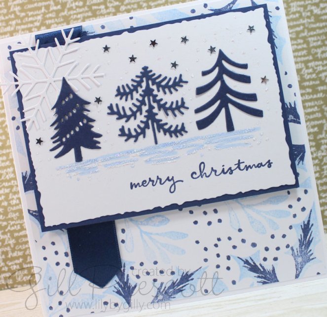 I used two shades of blue to stamp the background using the Christmas Season stamp set by Stampin Up. The sentiment is from Christmas to Remember …