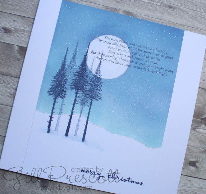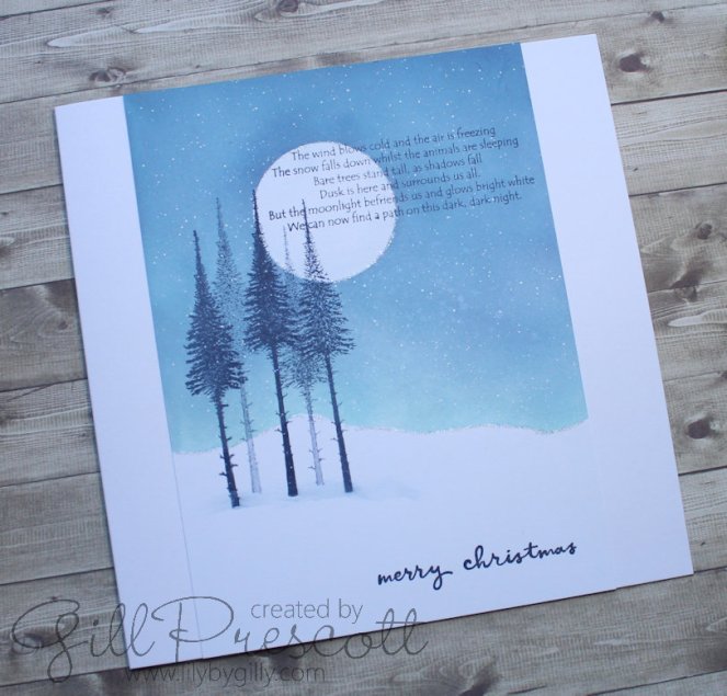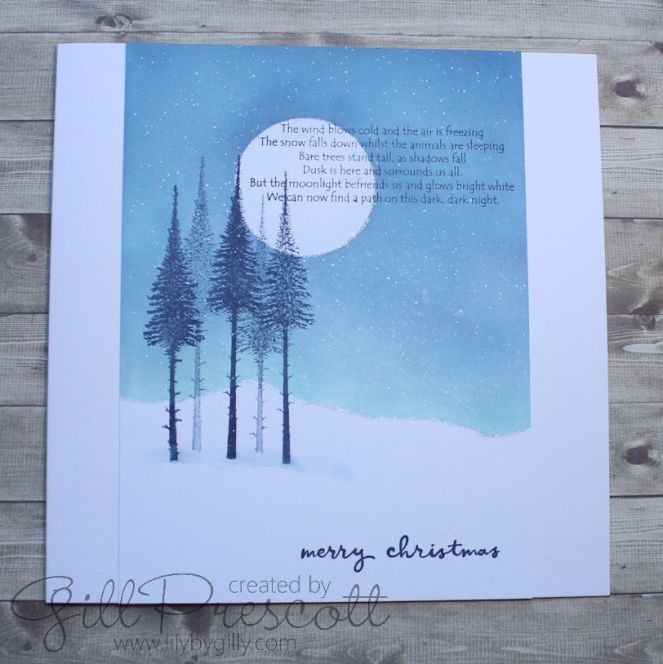 I just love the words of this wintery verse which I stamped over the moon – it seemed to sit beautifully nestled in the top of the trees.  I stamped a sentiment by Stampin Up, then mounted the panel in the centre of an 8in x 8in base card. This is bigger than my usual size cards, so I had to use a flat lay to photograph it!  Finally, I used a quickie glue pen along the outline of the moon and the top of the snow bank, and added some dazzling diamonds glitter for a little sparkle.