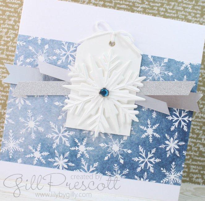 Snowflake dsp by Stampin Up from my stash made the perfect backdrop, and I added strips of silver mirri and glitter card – a great way to use up your scraps…