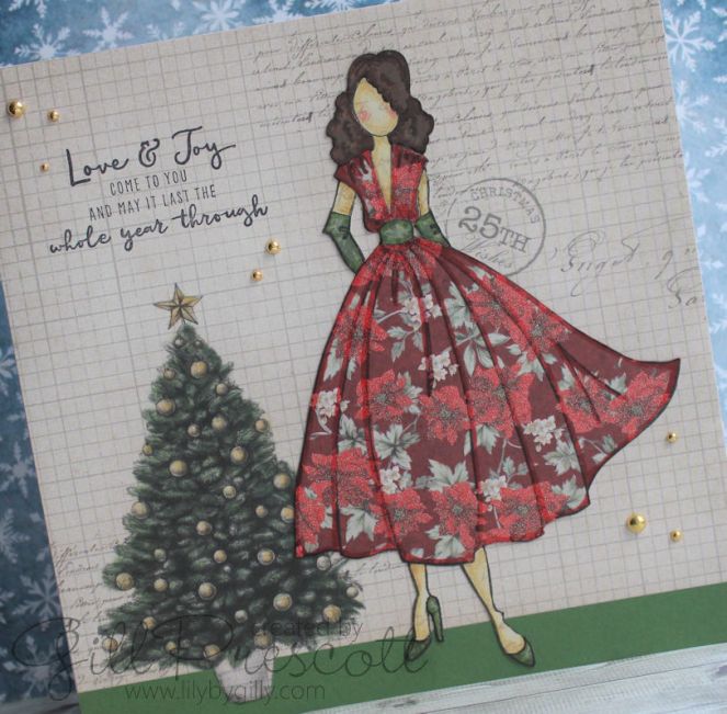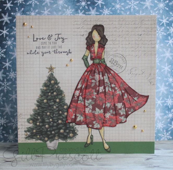 I inked up the Rita paper doll and stamped onto skin tone paper, also by Julie Nutting; this became the base that all the coloured paper pieces were adhered to. Next, I stamped the dress onto red floral paper from the Perfect Christmas paper pad, and the shoes, gloves and waistband onto a contrast paper in green. The hair was stamped onto a piece of brown Julie Nutting paper, then all pieces were fussy cut out.
