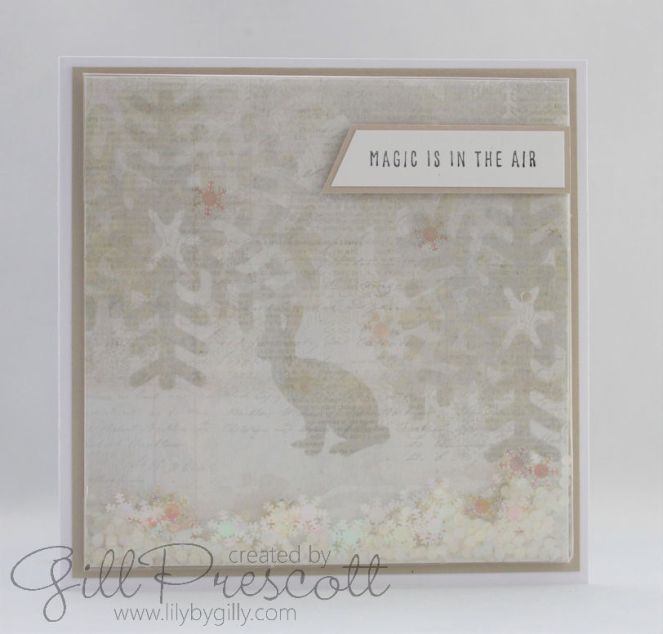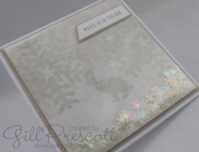 I cut a piece of dsp to size and inserted into an acetate bag, folding it on one edge to fit, then filled with snowflake sequins before sealing the bag. A few snowflakes were adhered to the dsp too.