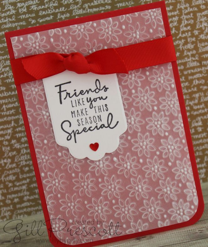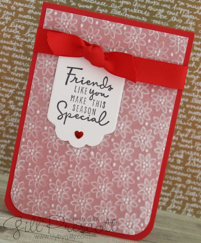 I first embossed the vellum using the petals a plenty embossing folder by Stampin Up, and adhered this to an A6 real red card base, leaving a 1/4″ border for the base colour to show through. I added just a think line of adhesive to still the vellum across the top of the card so I was able to easily cover the adhesive marks with a length of real red grosgrain ribbon.
