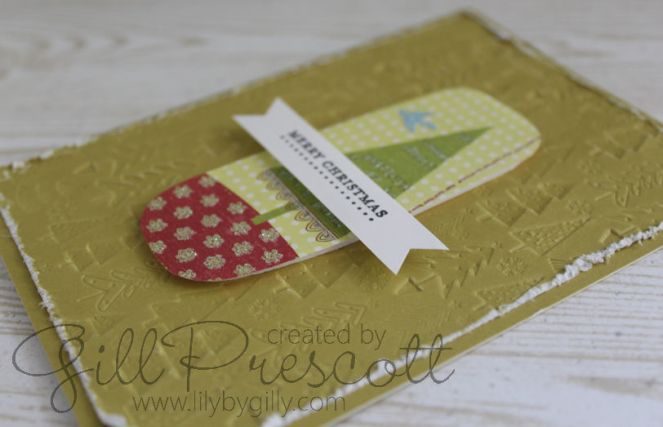 Finally, I rounded the top corners of both the card and the de-bossed layer, adhered the tree image to the centre and added a sentiment stamped on whisper white card and cut into a banner shape.