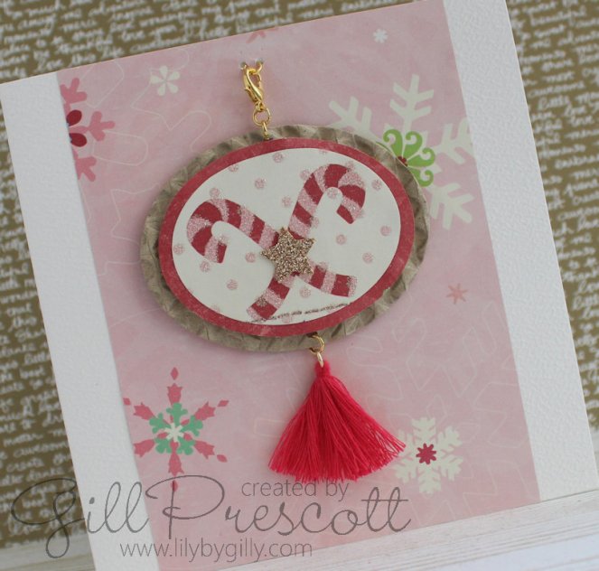Gold jump rings and a lobster clasp attached the ornament to the card and the tassle too. I decided not to add a sentiment and instead stamped the greeting on the inside.