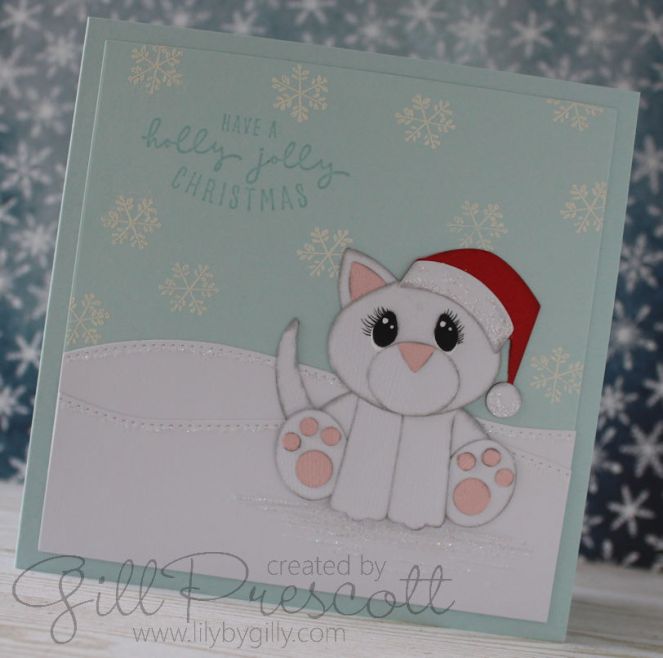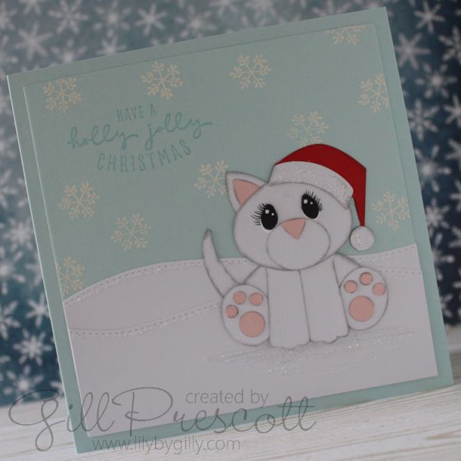 I made this kitty to look like my daughter’s cat, Lola, who is all white with pink paddy-paws. Poor little Lola had cancer and had an ear removed, so I decided to give her a Santa hat to keep her warm on that side, using the cool yule dies by Tim Holtz which was the perfect size.
