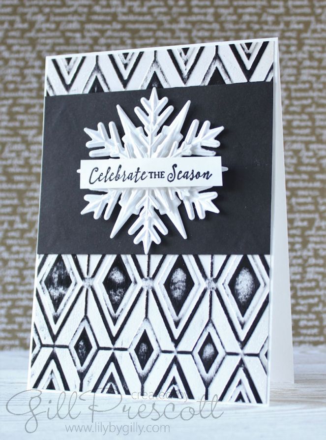 This first card is the one I submitted for the design team. I made the background paper by using a similar method to the black ice technique. As we couldn’t use anything but black or white, instead of using metallic card I embossed a piece of glossy white card with the Sizzix embossing folder rhombus pattern, swiped black stazon ink across and then added clear heat embossing all over. It’s hard to see the full effect in the photo but it has a fabric look to it. I mounted 3D embossed snowflakes by Tim Holtz with foam adhesive on top of the strip of black card and adhered everything to the base card.