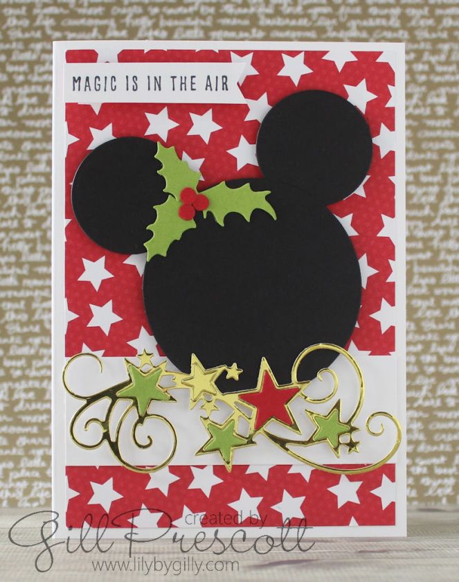 I used die cut circles for the head and ears, and added more die cuts for the holly and the stars, and the bow builder punch for Minnie’s bow…