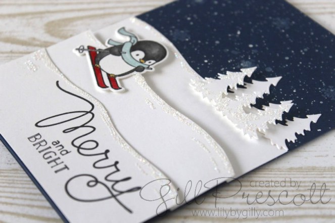 I used black ink to stamp the little penguin from the Penguins Go Skating stamp set by Mama Elephant and die cut with the matching dies. Colour was added using my Stampin’ write marker pens in basic gray, smoky slate, real red, soft sky and daffodil delight. I attached him with liquid glue and foam tape.