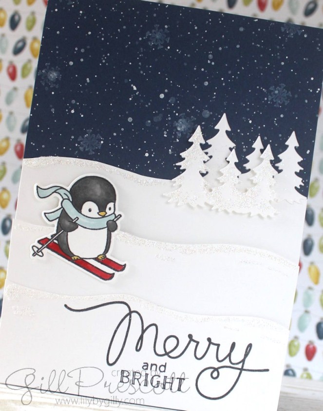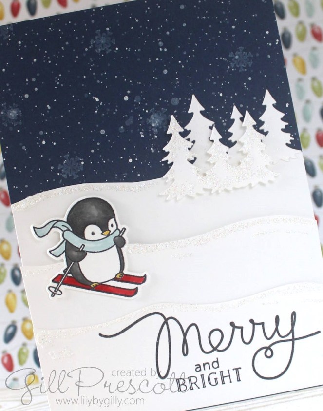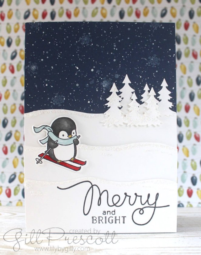 I added splashes of white ink using a posca pen to a piece of night of navy card to look like falling snow.  I stamped a few tiny snowflakes using white pigment ink, but they are a little difficult to see so I could have omitted this.
