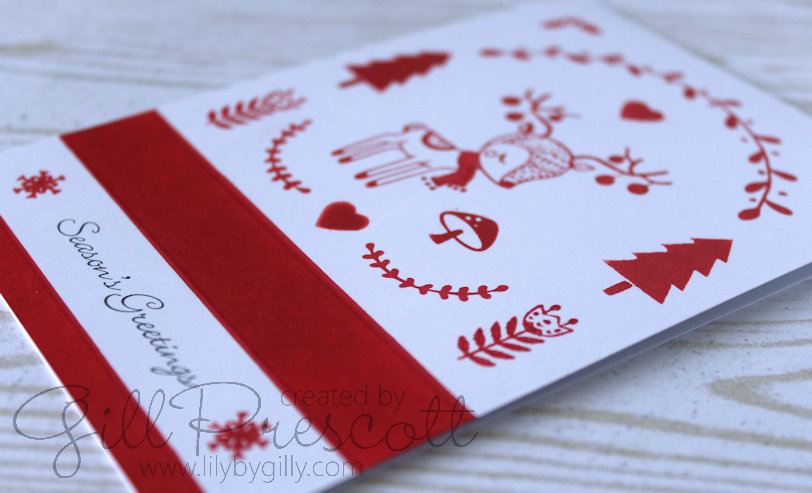 I haven’t done this much stamping for a long time and I loved every minute of it. It was fun looking through my stamp collection to find different images that worked well together and helped me create a Scandinavian look to my card.  I coloured some of the open sections of the images in using a real red ink marker, and masked off areas at the bottom of the card which I blended with the real red ink.