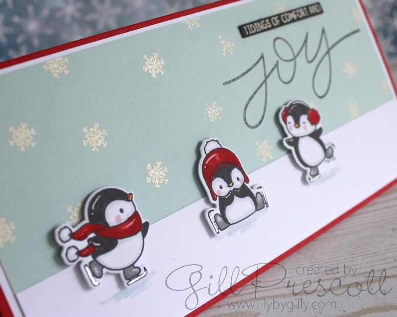 The penguins were popped up on some foam tape.  Finally, I added some white highlights using a white gel pen, coloured the blades of the skates with a silver metallic pen and added some shading below each penguin with the lightest shade of alcohol marker.