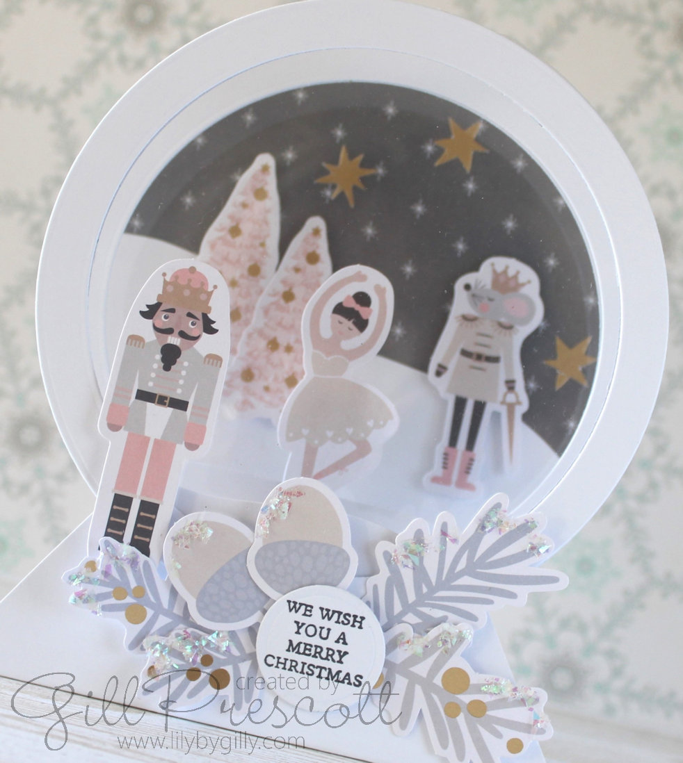 I chose to decorate my circle panels before assembling the card as I figured it would be easier to decorate them whilst flat.  I adhered a piece of dsp to the back panel, and added a piece of white card which was die cut using the larger die and cut with scissors in a curve to represent a snowy hill.  I used dimensional adhesive to adhere Nutcracker themed ephemera pieces from the Spellbinders Joyful Christmas card kit, and added gold stars from the kit.  For the middle circle frame, I created a snowbank as before, and ahered an ephemora piece to the centre.  For the outer circle frame, I adhered the acetate to the frame using scor-tape, then added a snowbank as before.