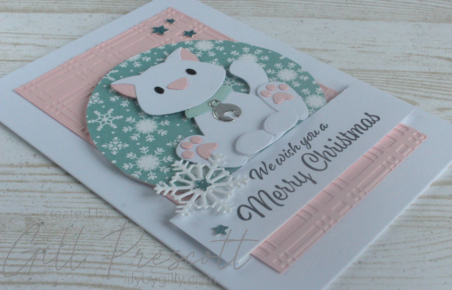 The background features pink pirouette cardstock embossed with the Spellbinders Plaid Company embossing folder, adding a lovely textured effect that gives the card a cosy, festive feel. I then layered a circle die-cut in dsp to create a focal point, adding a wintery backdrop for the focal image.