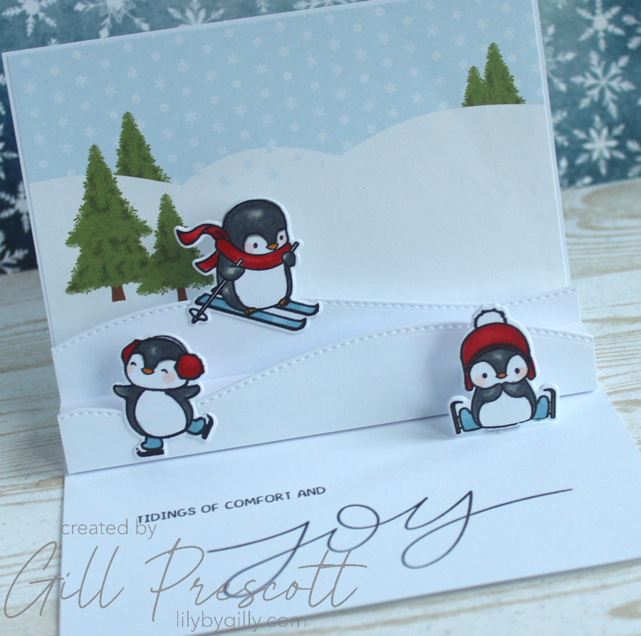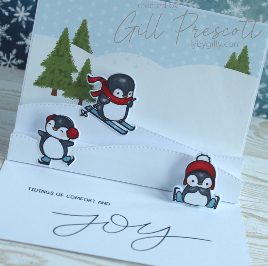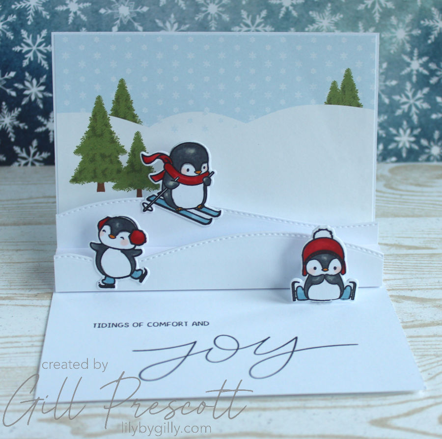 This project beautifully combines the whimsical charm of Mama Elephant’s ‘Penguins Go Skating’ stamp set with the interactive surprise of a pop-up card, which folds flat for posting. By adapting Sam Calcott’s tutorial, I was able to create a cute and delightful Christmas card, perfect for this week’s 52 Christmas Card Throwdown challenge.