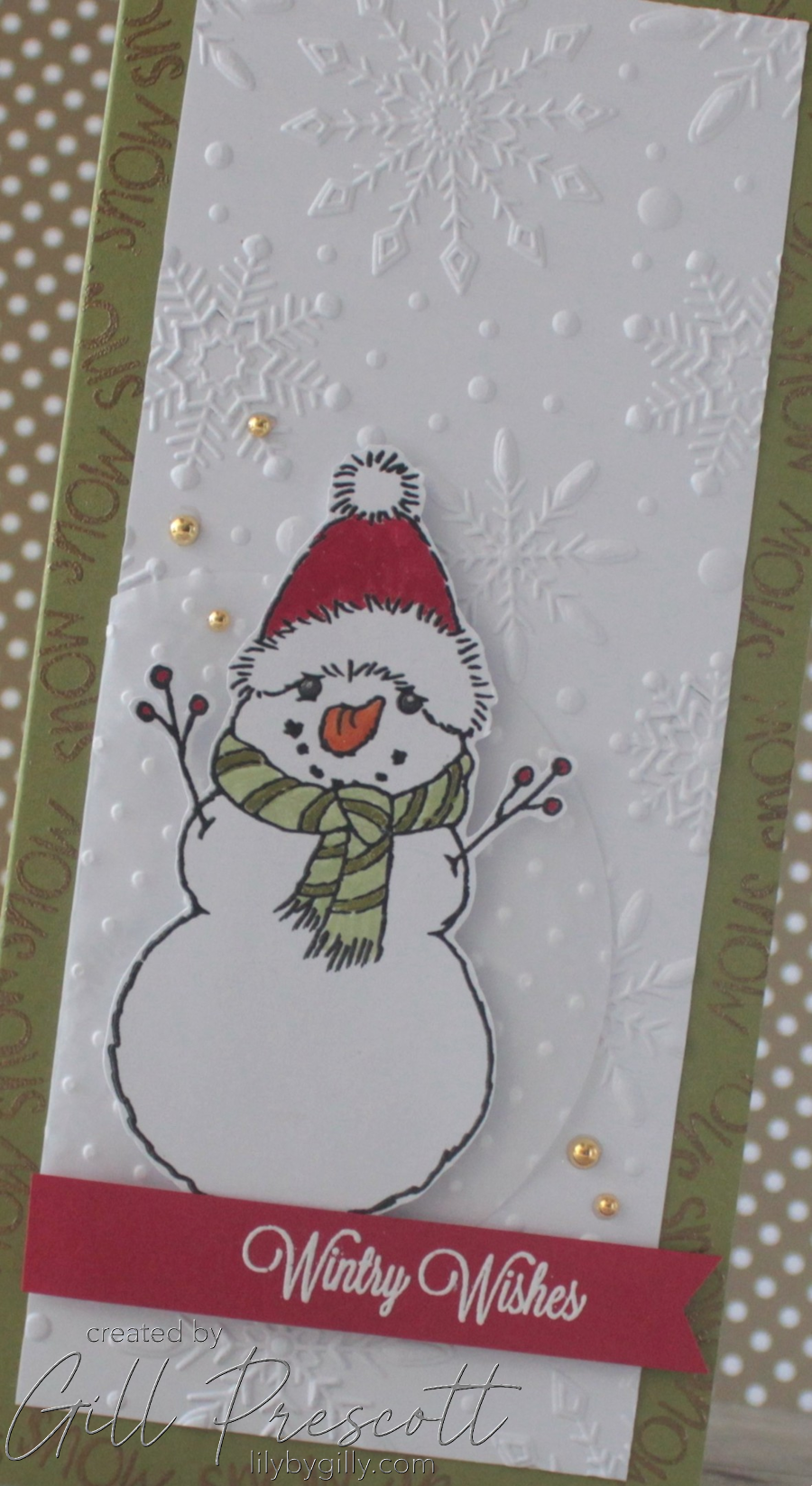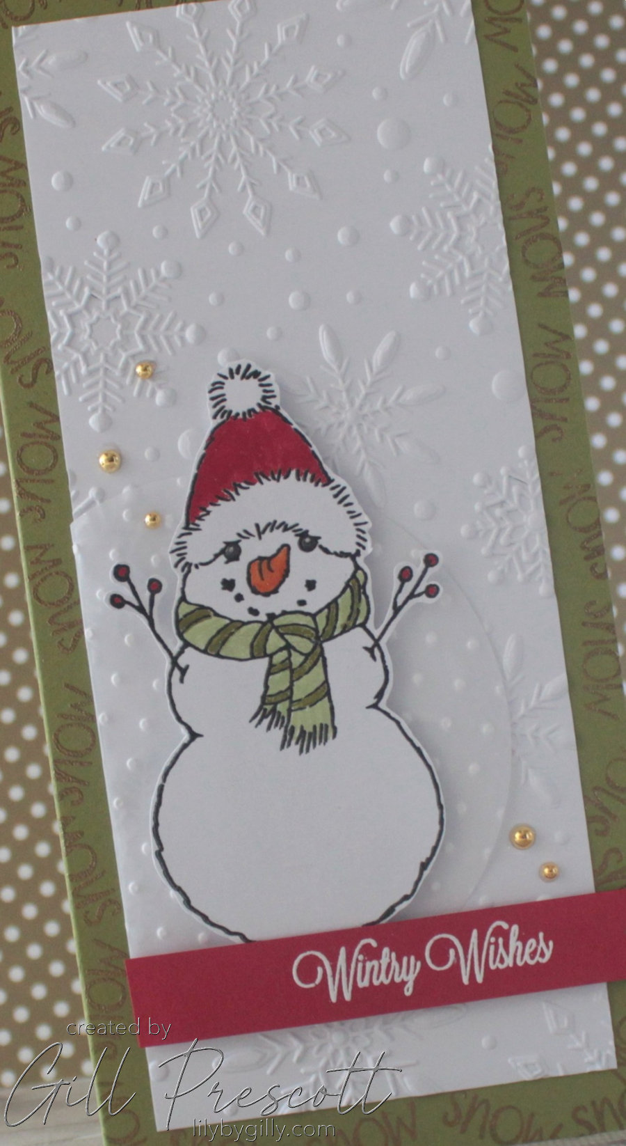 For the sentiment, stamp “Wintry Wishes” from The Winter Garden Sentiments by Spellbinders in Versamark ink onto real red card, heat emboss it in white, and cut it into a banner with a flagged end to one side. Attach it below the snowman with more foam tape making sure the snowman is tucked behind so he is not “floating”.