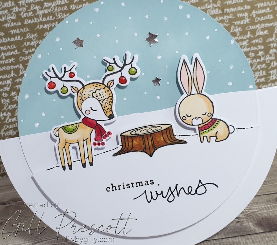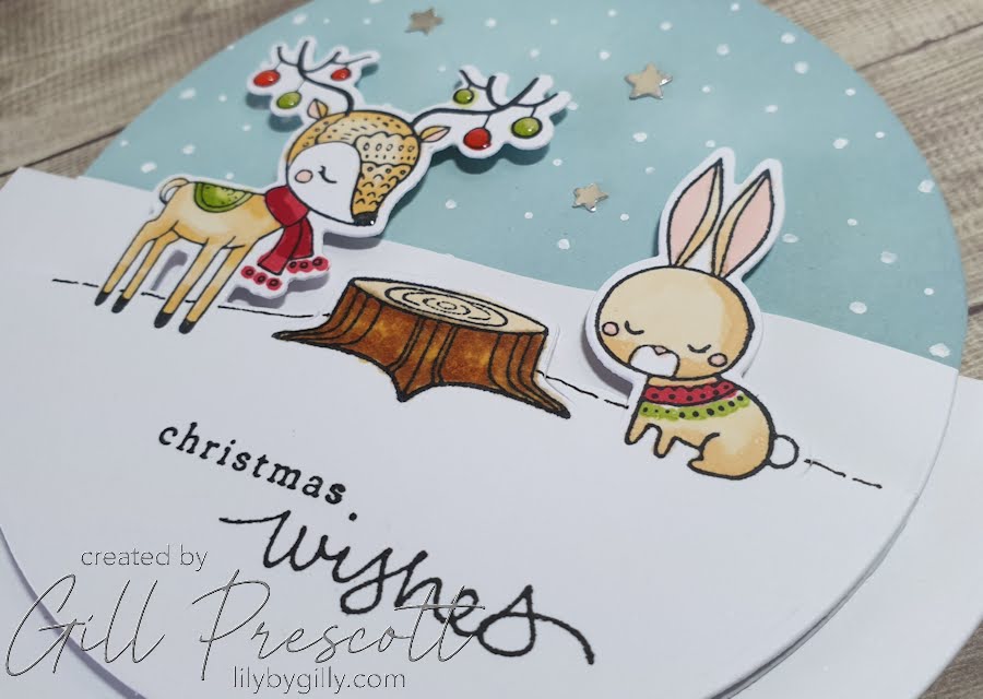 The adorable deer, rabbit and tree stump all came from the Folk Christmas stamp set by Sizzix. I stamped them in Versafine Clair Nocturne ink for a crisp black outline onto a die cut circle.