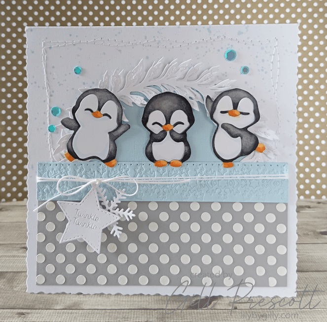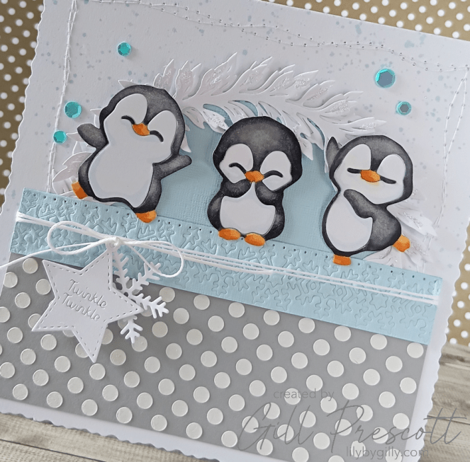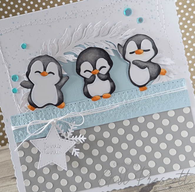 For the stars of the show, I die cut three cute penguins from white cardstock. Using alcohol markers, I coloured them in soft greys and blacks, with cheerful yellow beaks and feet. A little pale blue shading around the white areas gave them a frosty look.