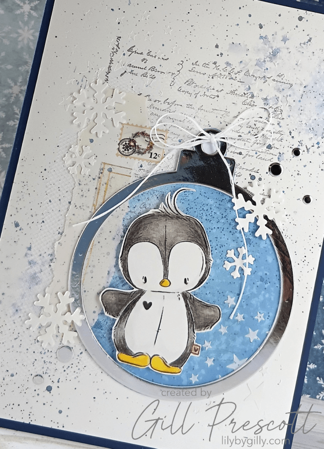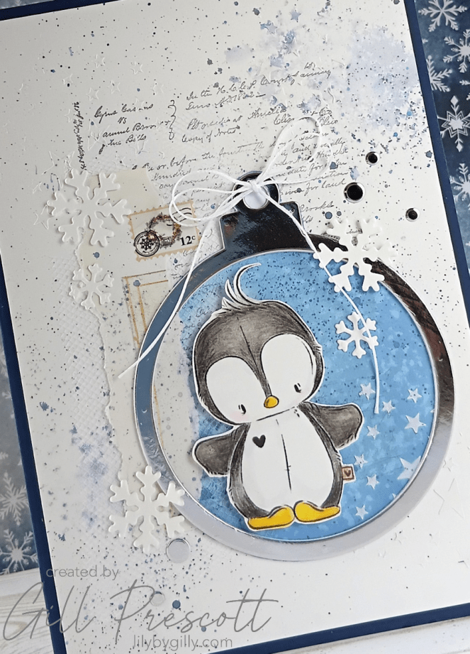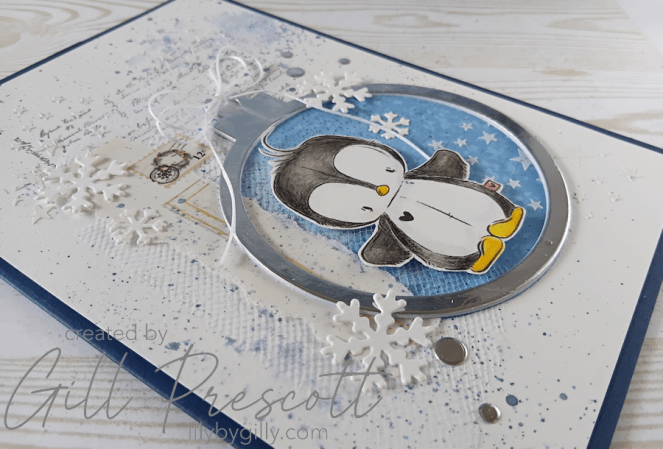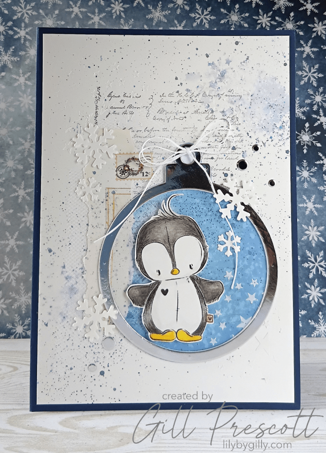 For the centre of the bauble, I used a digi image of a penguin, coloured with watercolour pencils on watercolour paper. Once it was fussy cut, I adhered the penguin inside the bauble using foam adhesive, so it really stood out against the background.