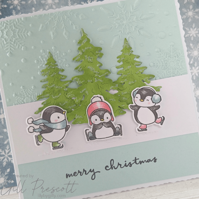 To bring in a bit of festive sparkle, I added Dazzling Diamonds glitter to the trees and the snow beneath the penguins, applying it with a quickie glue pen. The glitter catches the light beautifully and adds that frosty finish.