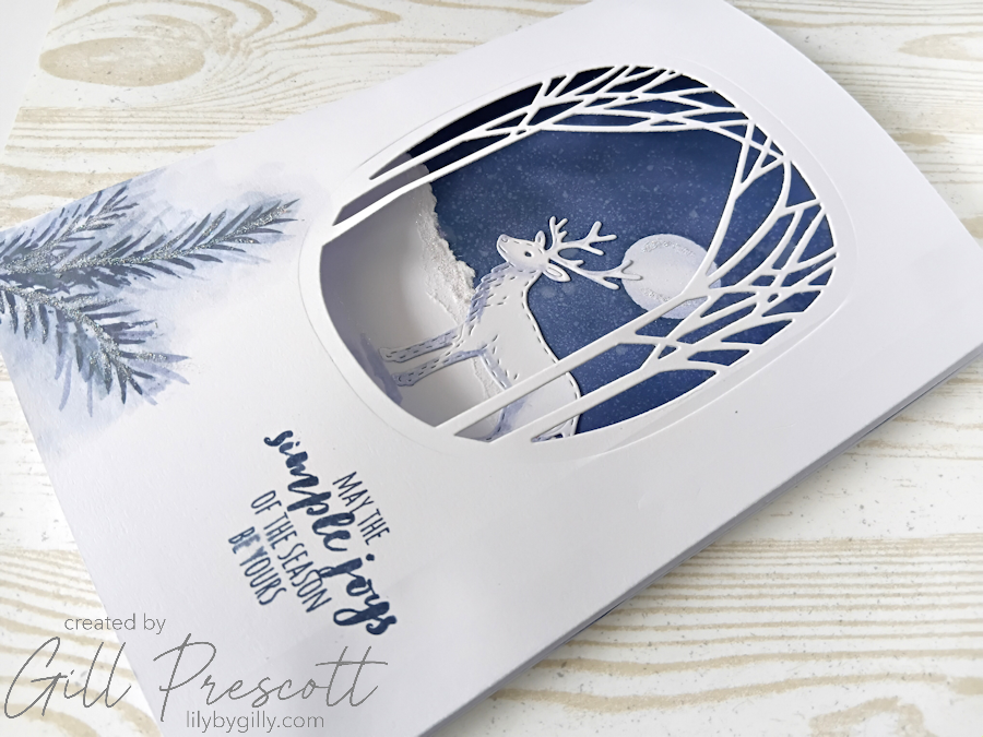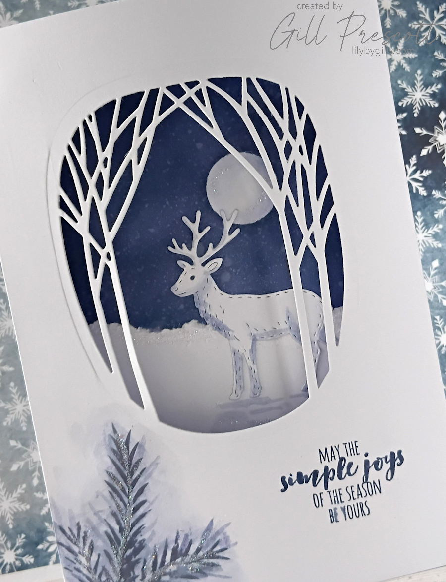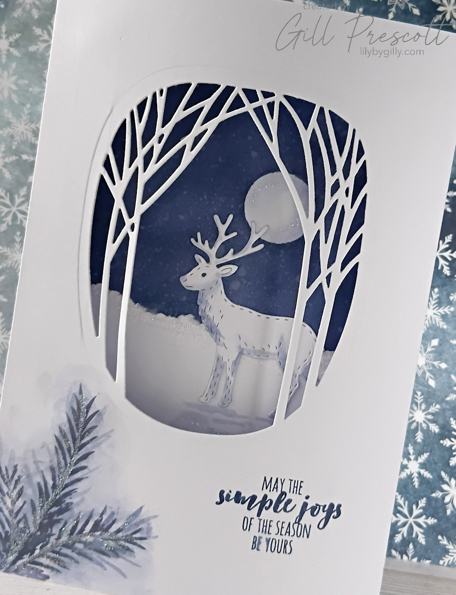I’m hosting the challenges at 52 Christmas Card Throwdown during November.  This week, I chose one of my absolute favourite themes… A Winter Scene! There’s something magical about snowy skies, crisp silhouettes, and serene landscapes, and I couldn’t resist creating a peaceful moonlit moment for my card.