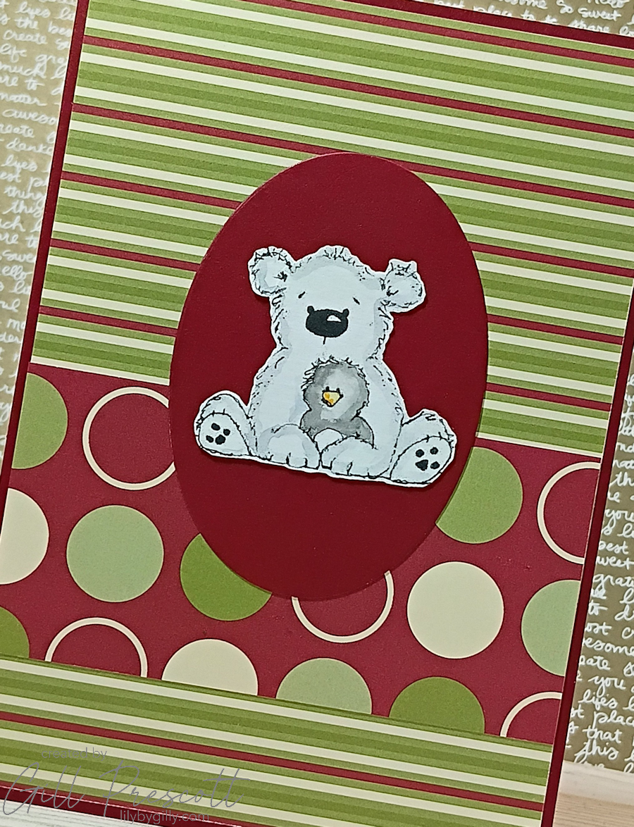Because this was a colour-focused challenge, I let the red and green do most of the talking. I kept the design clean, simple, and deliberately spacious on the front so I could add a personalised greeting.  Some dsp from my stash and a cute watercoloured image by Louise, was all this card needed.