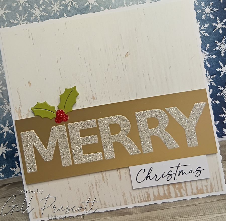The main feature of the card is the word “merry”, cut using the bold alphabet letter dies from Craft Addiction UK, which are are such good value at £8.70 for the set. I die cut the letters from silver white glitter card, then adhered them to the gold panel.