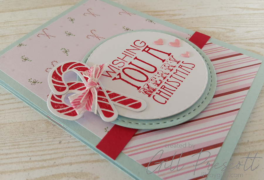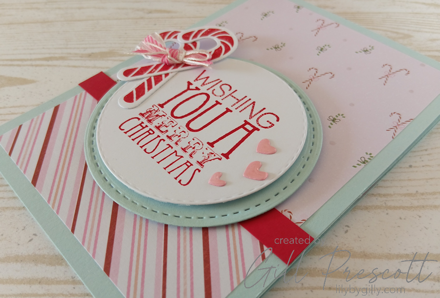 Full of soft, pretty patterns, including one covered in tiny candy canes, it practically made the design decision for me. I paired it with a co-ordinating candy stripe and let the papers do most of the talking… with a few fun extras along the way.